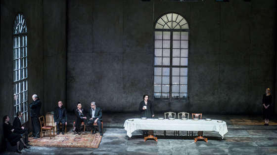 © Александринский театр Но тут (конец третьего акта, на часах уже почти полночь) на сцену впервые выходит фрау профессорша (Долореса Казрагите) — женщина с расшатанной психикой, не одно десятилетие страдающая навязчивой галлюцинацией. Ей слышатся крики нацистов с гитлеровского митинга на площади Героев. Поминки начинаются. Персонажи оживленно шушукаются, набрасываются на еду, профессорша обращается в слух… Но никаких галлюцинаций не будет. Только удар брошенного камня. Оконные стекла разлетятся вдребезги. Внешний мир властно заявит о себе, а усмешка застынет на твоем лице, превратившись в болезненную гримасу. Вода не смешивается с маслом, а талант смеяться над собой никак не поможет предотвратить грядущий погром.