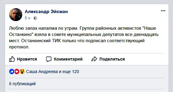 Публикация кандидата "из списка Гудкова" от 4 округа Пресни Facebook И, в конце концов, не стоит забывать, что победителем на выборах, все-таки, является «Единая Россия». «Команда Гудкова» смогла взять только около 150 мандатов из 1502 — это хороший результат, но до победы по всему городу еще далеко.