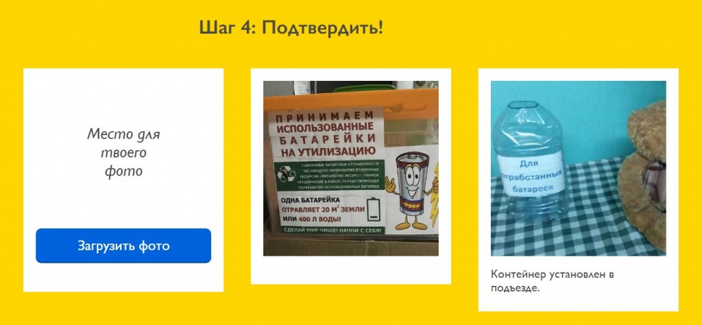 Первым шагом коротко рассказано о проблеме, вторым – объясняют, как спланировать акцию и что для этого нужно (контейнер во дворе, школе, подъезде), третьим шагом предлагают выполнить задуманное. А четвертым – прислать фотографию и описание к ней.