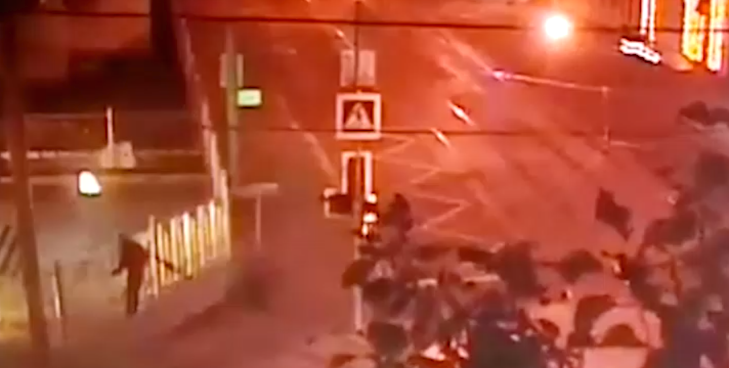 Огонь повредил стену здания. На видео с камеры наблюдения, которое публикует телеграм-канал, видно, как человек поджигает и бросает три бутылки подряд.