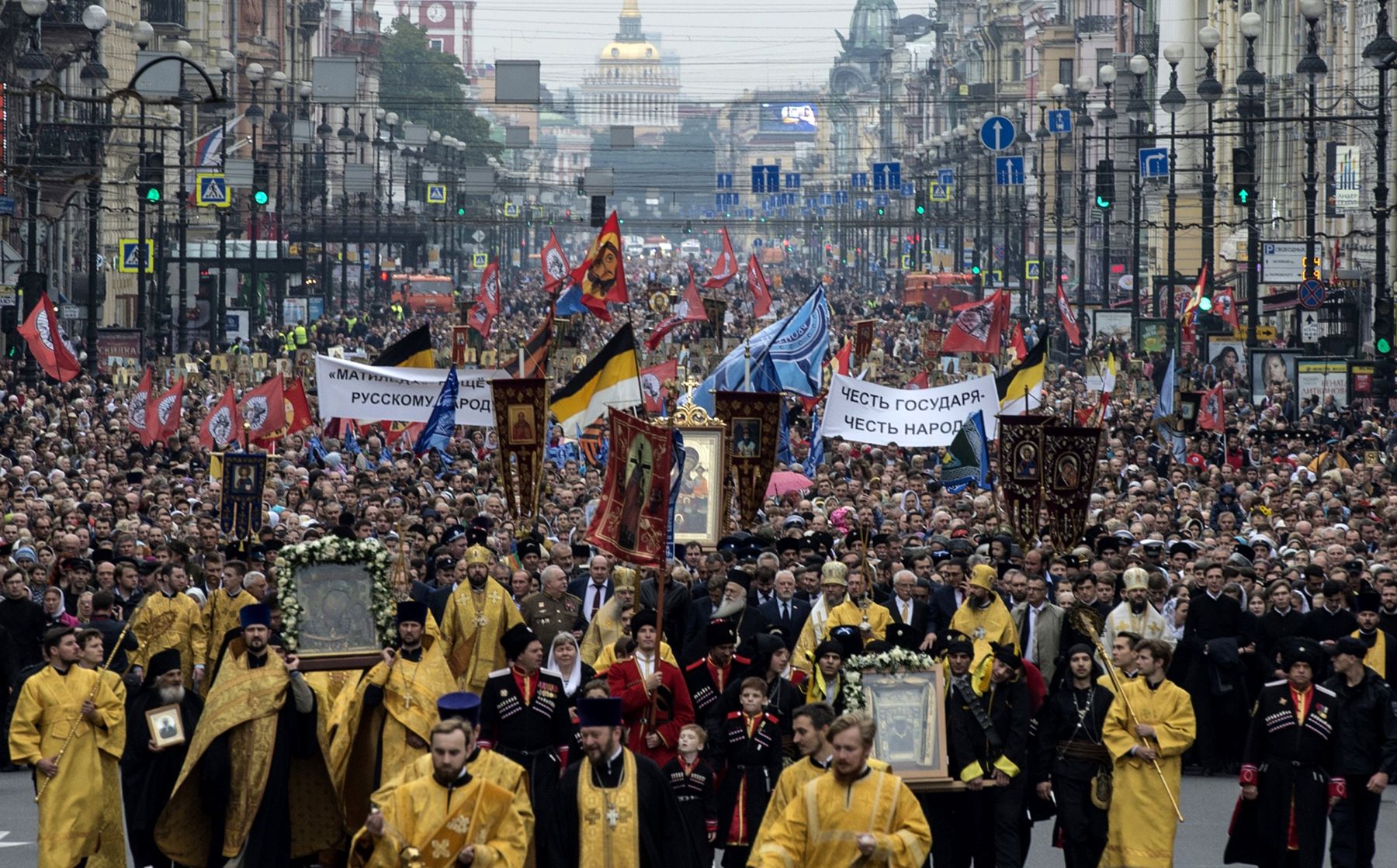 Александр Гальперин / Sputnik / Scanpix / LETA 12 сентября на Невском проспекте в Санкт-Петербурге прошел ежегодный крестный ход в связи с днем перенесения мощей Александра Невского. В этом году, по оценкам МВД и митрополии, в шествии приняли участие около 100 тысяч человек. Участники одной из колонн несли транспаранты с текстом «Матильда — пощечина русскому народу» и «Честь государя — честь народа».