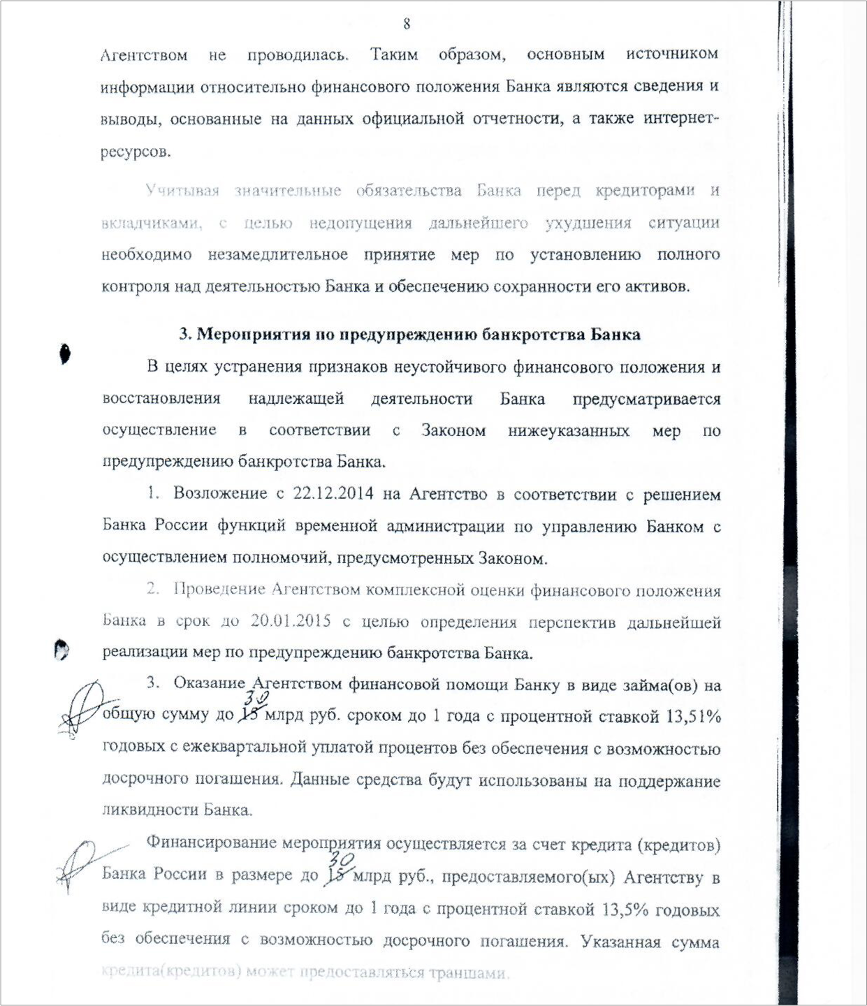 В распоряжении «Медузы» есть документ с составленным планом участия АСВ в предупреждении банкротства «Траста». В нем зафиксирована цифра, необходимая агентству на эти цели, — 15 миллиардов рублей. Эта цифра зачеркнута — и прямо поверх нее размашистым почерком первого заместителя председателя ЦБ Алексея Симановского написана сумма вдвое больше: 30 миллиардов. «То есть первая цифра была из головы и вторая тоже из головы, — объясняет Юров. — Никаких экономических обоснований удвоения цифры там не было».