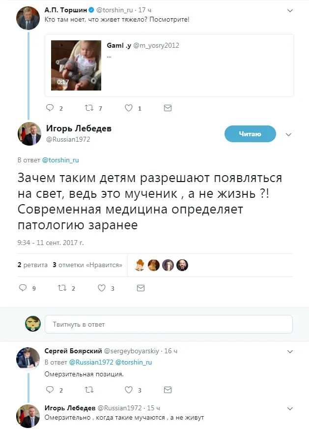 В ответ на твит, в котором экс-сенатор Торшин демонстрирует видео с ребенком без рук, Лебедев заявляет: