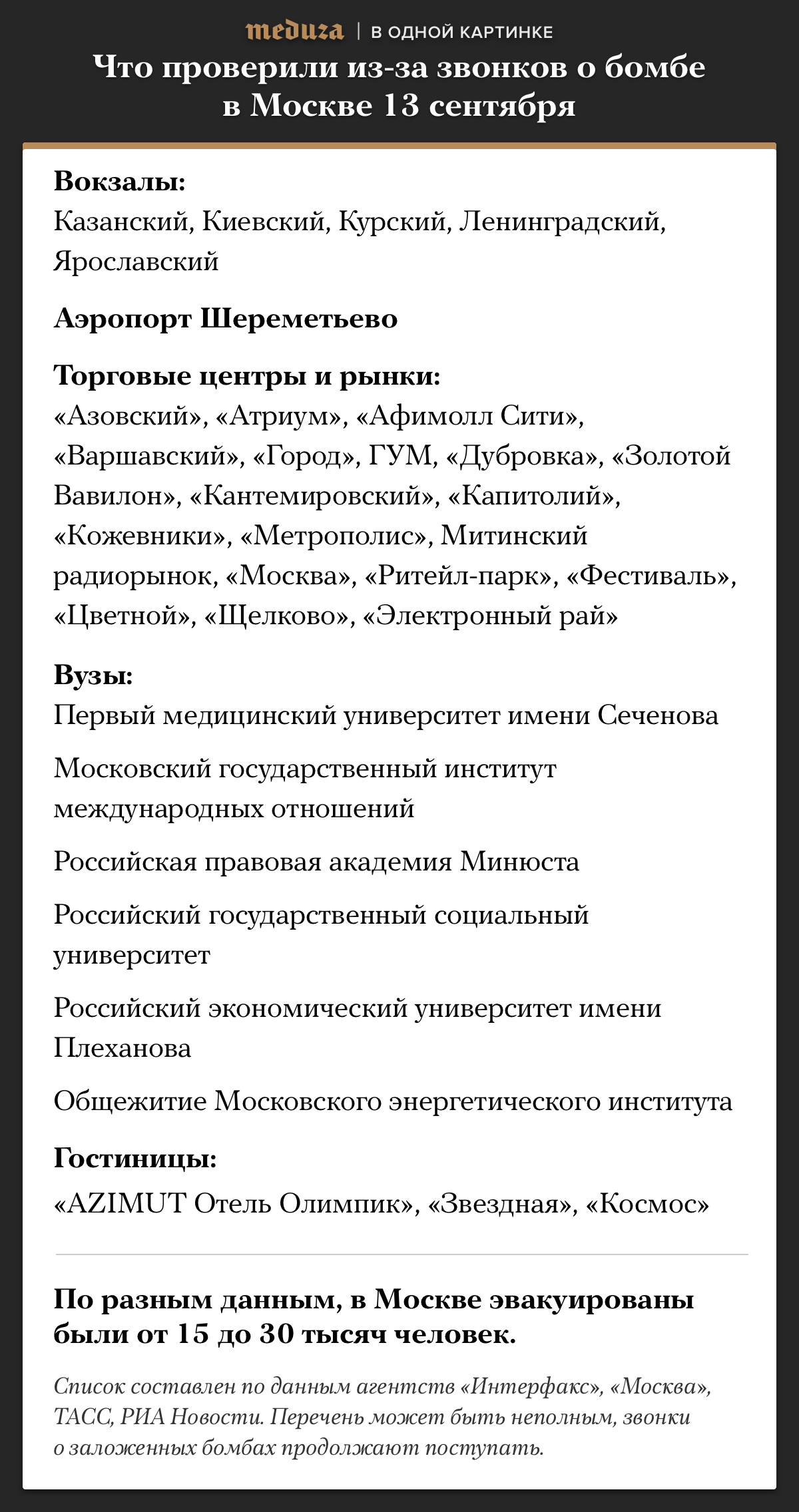 Волна эвакуаций из-за сообщений о бомбах, которая началась 10-11 сентября в российских регионах, дошла до Москвы. За один день в столице из торговых центров, вокзалов и вузов эвакуировали около 15-20 тысяч человек.