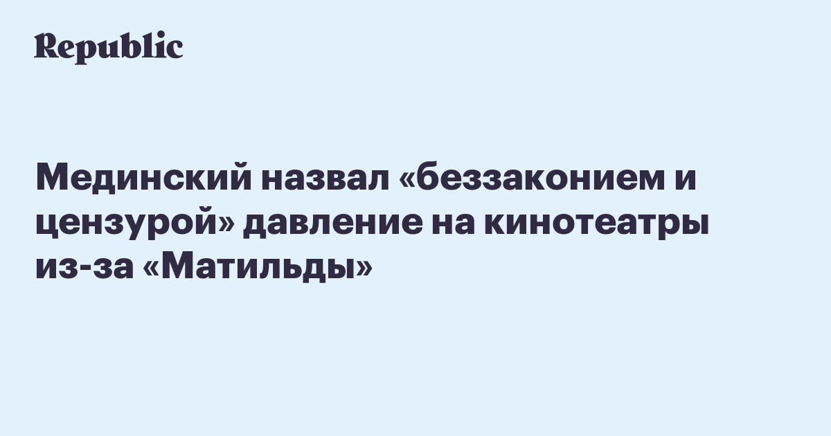 Министр культуры Владимир Мединский счел «опасным прецедентом» отказ объединенной сети кинотеатров «Синема парк» и «Формула кино» от показа фильма «Матильда» режиссера Алексея Учителя. Его цитирует «Интерфакс»: