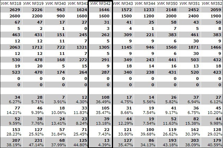 При этом на всем округе единороссы набрали 39,47%, а КПРФ — 27,82%. ЛДПР получила только 12%, «Коммунисты России» — 6,26%. Глава УИК №342 Сергей Милюшенко заявил «СуперОмску»», что члены комиссии «по ошибки» перепутали «ЕР"с «Коммунистами России», а ЛДПР — с КПРФ.