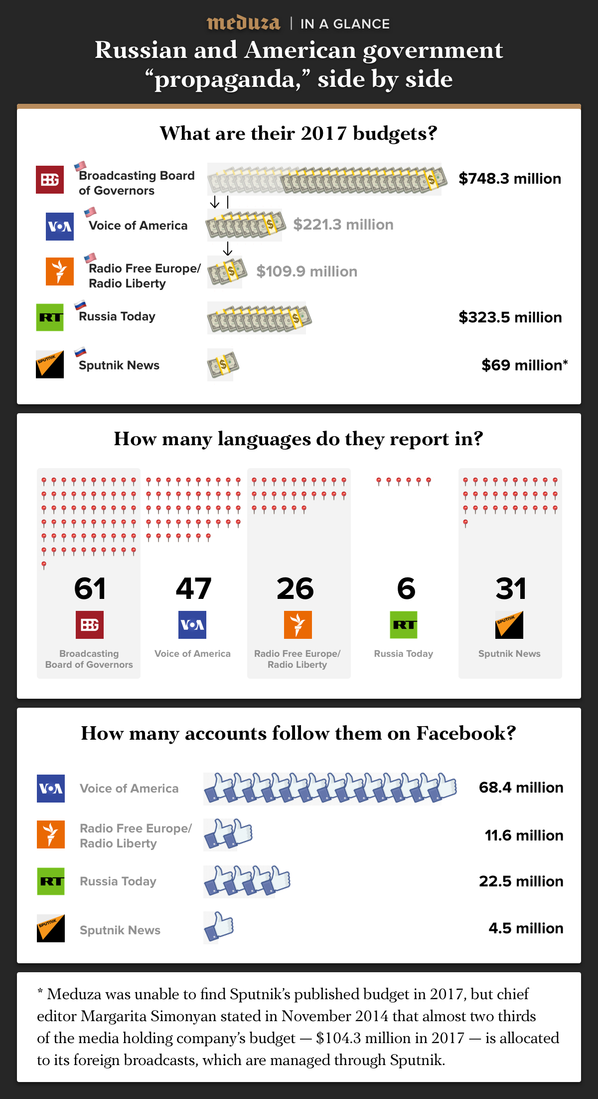 In this infographic, Meduza compares the U.S. government’s international news media to RT and Sputnik, to get a better sense of just how big these operations are, relative to each other.