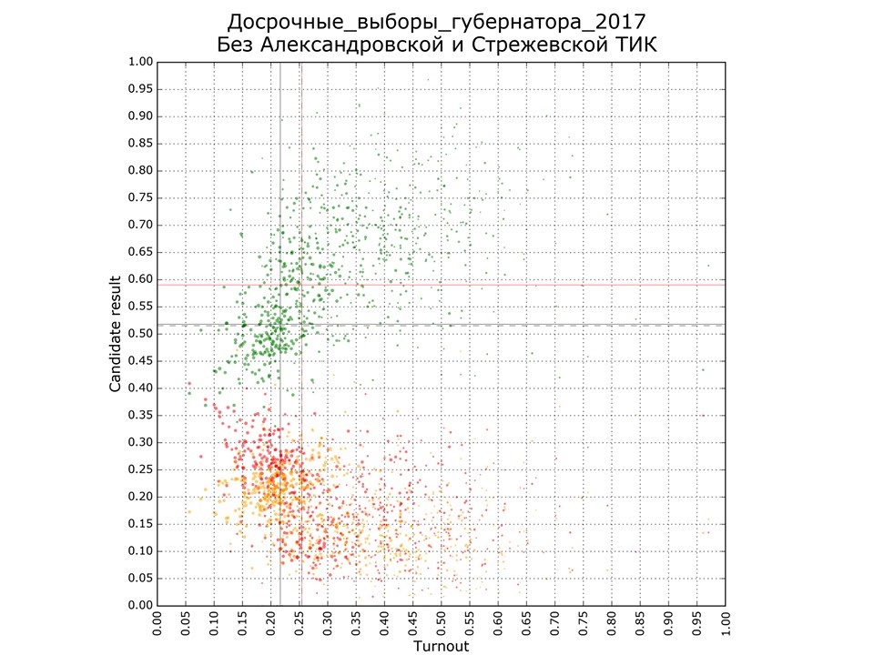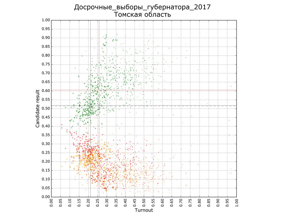 Есть и другие графики по Томской области, свидетельствующие о нарушениях (что плохо), но также свидетельствующих и о том, что в целом по области отсутствовала установка на какой-то конкретный результат (что хорошо). Вообще таких графиков можно построить несколько, ведь выборы, образно говоря, явление многомерное, а каждый график – это лишь проекция на одну из плоскостей, в зависимости от заданных параметров. Но здесь, наверное, нет смысла загружать ваших читателей излишней информацией, поскольку ничего принципиального она не добавляет, а лишь подтверждает сказанное мной ранее.