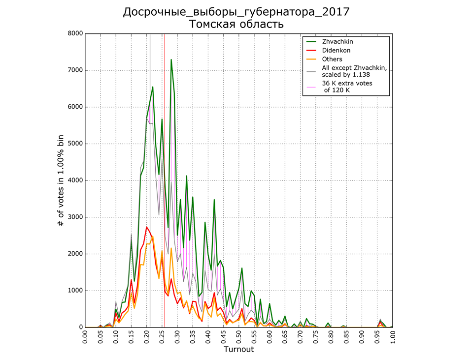 На основании открытых статистических данных Сергей Шпилькин рассчитал, что на выборах губернатора Томской области могло быть приписано до 36-и тысяч лишних голосов в пользу действующего главы региона и, соответственно, настолько же могла быть завышена реальная явка избирателей. Это, по словам ученого, лишь вероятностная оценка, не имеющая юридической силы, к тому же – подлежащая некоторой корректировке с учетом местной специфики.