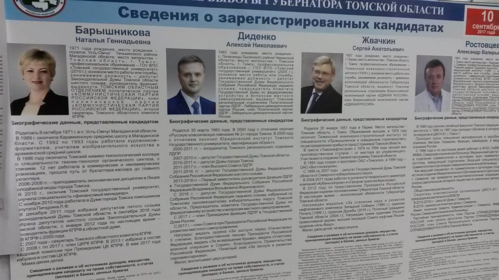 10 сентября 2017 года выборы глав субъектов Федерации состоялись в шестнадцати регионах России, и по уровню фальсификаций Томская область находится в числе умеренных регионов. У нас не замечено столь явных подтасовок результатов выборов, как например, в Мордовии, в Саратовской и Белгородской областях.
