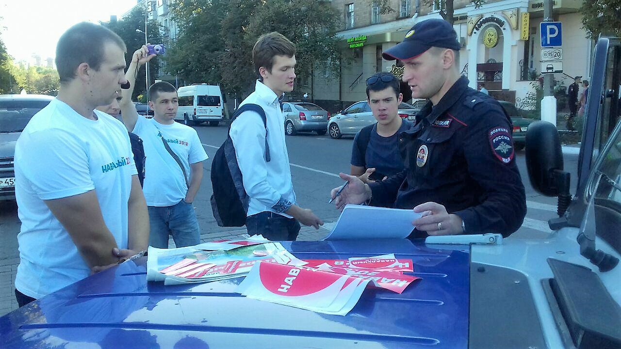 — Затем к сотрудникам ППС присоединились две женщины-офицера, которые также начали обвинять нас в распространении экстремистской литературы, — рассказал юрист Евгений Соколов. — За ними подтянулся еще один полицейский патруль. Затем появился мужчина, представившийся начальником ППС Белгорода, и потребовал, чтобы мы проехали в полицейский участок. Затем появился неизвестный в гражданском, он представился сотрудником отдела «Э» и забрал одну из конфискованных газет. Через полтора часа после бесед на улице нас обыскали и составили соответствующие протоколы. Газеты, наклейки и сумки с надписями в поддержку Навального у нас изъяли. Примерно в 18:30, когда уже прошло примерно три с половиной часа, полицейские наконец-то закончили составление протоколов обыска и конфискации печатной продукции и повезли волонтеров в участок. Их держали в отделении до 20:00 и даже не выдали копии протоколов. Лишь одного волонтера не стали забирать в отдел как несовершеннолетнего, поскольку его можно допрашивать только в присутствии законных представителей.
