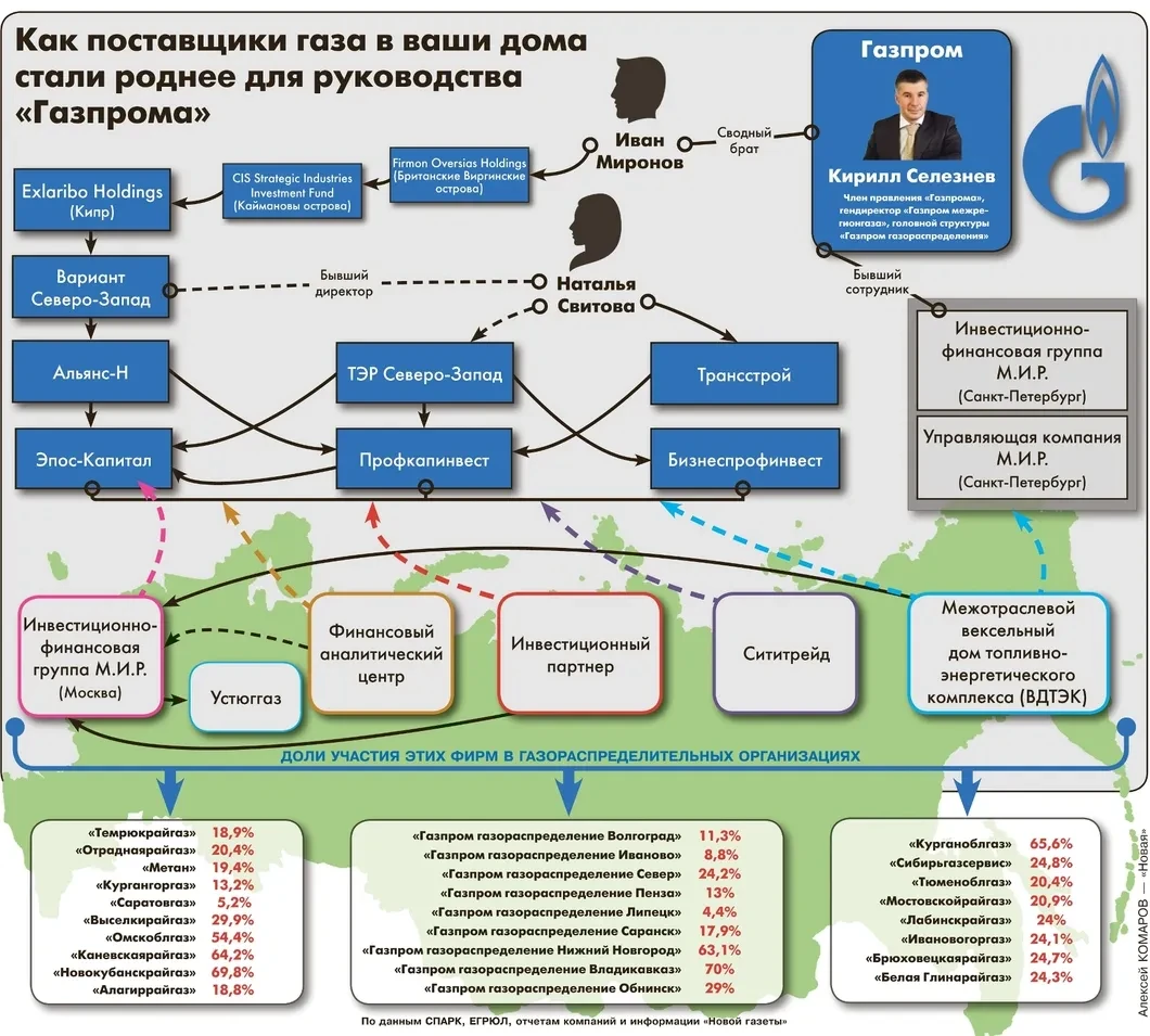 Как выяснила «Новая газета», недавние партнеры фирм Миронова и Свитовых владеют долями в газораспределительных организациях системы «Газпрома» — горгазах и райгазах по всей России, которые транспортируют газ от магистрального газопровода до конечного потребителя, обслуживают внутридомовое газовое оборудование и проектируют сети регионального газоснабжения (подробнее — см. схему).