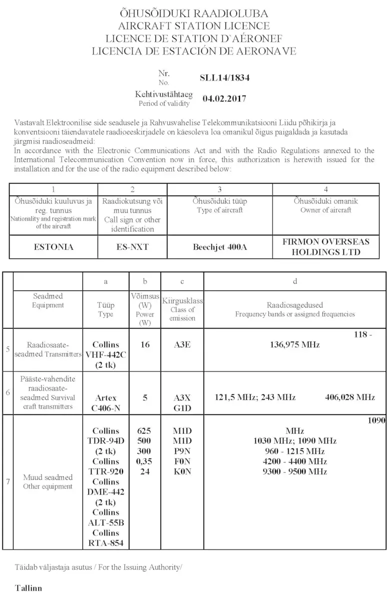 «Новая газета» выяснила, что лицензия на радиостанцию воздушного судна Beechjet 400A бортовой номер ES-NXT действовала с 2014 года и продлена до начала 2017 года. Все это время самолетом владела офшорная фирма Firmon Overseas Holdings, зарегистрированная на Британских Виргинских островах.
