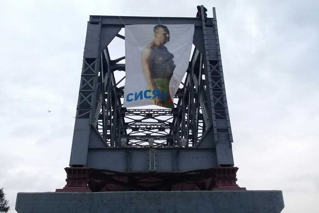 Неизвестный вывесил фотографию полуголого Навального на опоре моста. Его задержали.