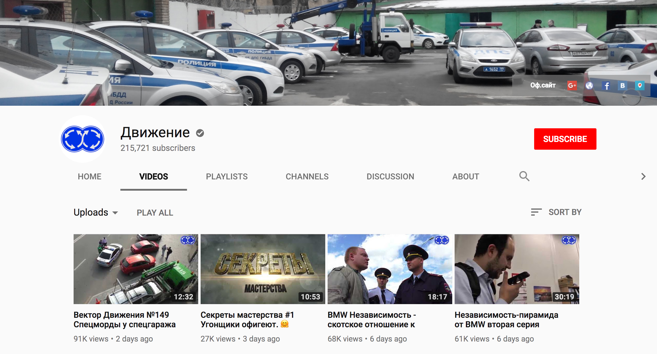 Главная страница YouTube-канала «Движение», авторы которого публикуют видеоролики о нарушениях правил дорожного движения, оказалась заблокирована для пользователей в России. О блокировке рассказал в твиттере и перископе координатор проекта Андрей Филин.