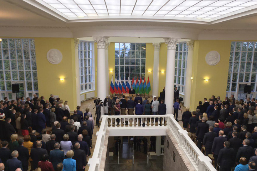 Почти все представители СМИ наблюдали за церемонией с балкона. Постоять рядом с главой распорядители разрешили только нескольким журналистам и нескольким фотографам, предупредив, что остальных сотрудники ФСО ближе не пустят. Церемония прошла под живую музыку — на нее пригласили академический хор Петрозаводского госуниверситета и музыкантов карельской государственной филармонии.