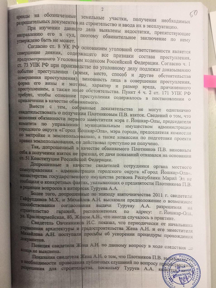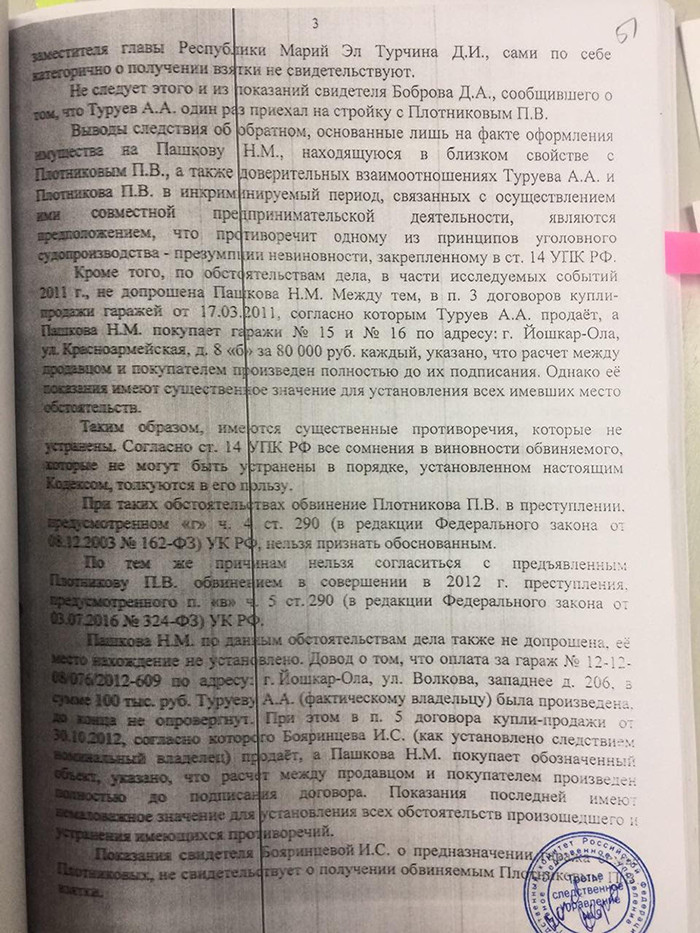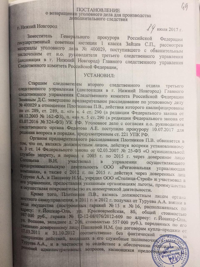 С 12 сентября в Йошкар-Оле идет суд над бывшим мэром города Павлом Плотниковым. Он обвиняется в незаконном участии в предпринимательской деятельности и получении взятки. В первый день суда экс-мэр заявил, что считает выводы следствия по своему уголовному делу голословными, основанными на показаниях осужденного за покушение на него предпринимателя Александра Туруева. Высказав это мнение, Плотников сослался на официальное заключение замгенпрокурора по Приволжскому федеральному округу Сергея Зайцева. В распоряжении «7x7» оказался этот документ. Редакция пересказывает его содержание.