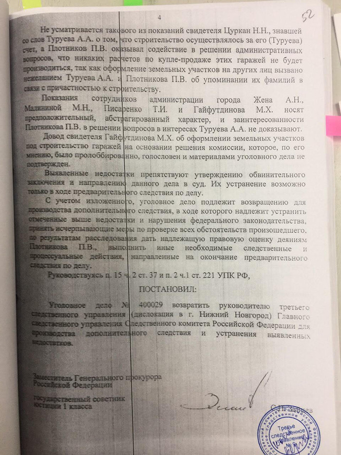 Существенные противоречия в деле не устранены, считает заместитель генерального прокурора. Уголовно-процессуальный кодекс трактует все сомнительные моменты, которые не могут быть устранены, в пользу обвиняемого. Зайцев делает вывод, что обвинение Павла Плотникова в получении взятки нельзя признать обоснованным. Он написал в постановлении, что уголовное дело Плотникова «подлежит возвращению для производства дополнительного следствия, в ходе которого надлежит устранить отмеченные выше недостатки и нарушения федерального законодательства, принять исчерпывающие меры по проверке всех обстоятельств произошедшего».