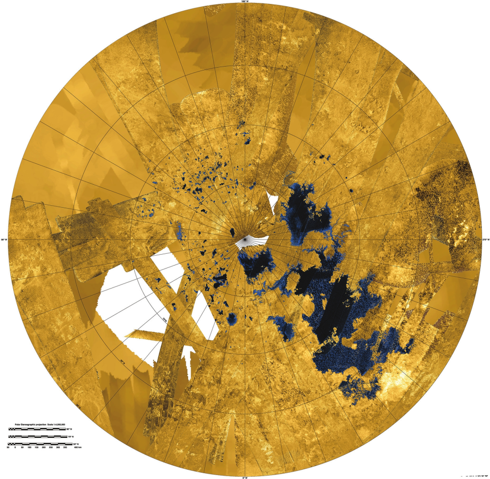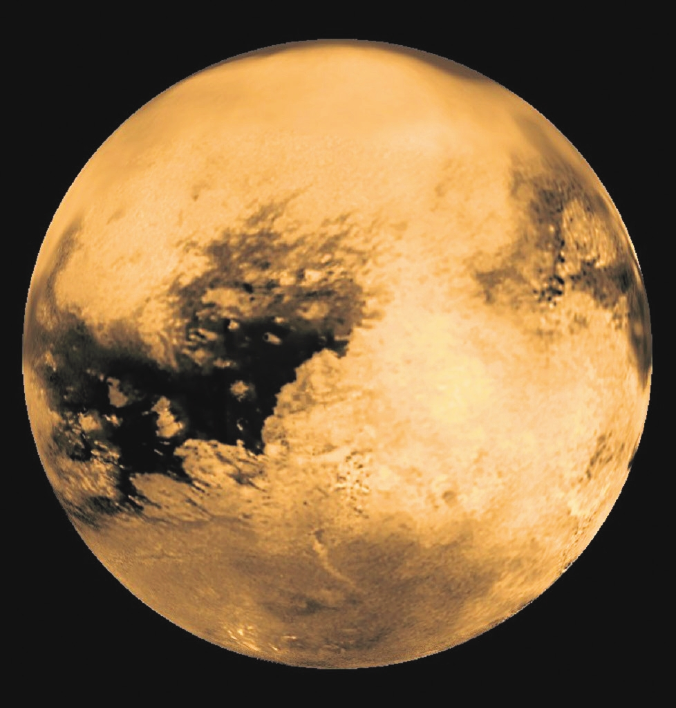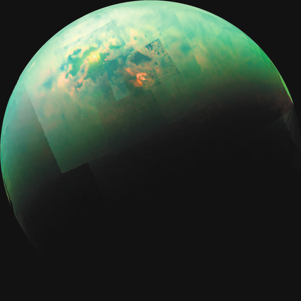 Титан окутан дымкой, рассеивающей видимый свет. Дымка возникает от облучения верхних слоев атмосферы космическими лучами, которые разбивают молекулы азота и метана; осколки образуют более сложные большие молекулы, конденсирующиеся в аэрозоли. Дымка становится полупрозрачной в инфракрасных лучах — на снимках проявляется география планеты (1). Но гораздо больше информации дает радиолокация. Именно радиолокация выявила озера и моря на Титане (2). Крупнейшее — море Кракена. Его берега очень изрезаны, а площадь превышает Каспийское море. Рядом — Лигейское море (2а) размером с крупнейшее после Каспия земное озеро Верхнее из системы Великих озер на границе Канады и США. На радиолокационной карте северной околополярной области (2) сосредоточено где-то 97% суммарной площади озер. Их уровень сильно меняется в зависимости от сезона. Сейчас в северном полушарии зима, озера разлились и заполнили русла рек — отсюда длинные ветвистые заливы. При смене сезонов бóльшая часть жидкости испарится и выпадет дождями в южном полушарии. Кстати, атмосфера Титана способна удерживать в сотни раз больше метана, чем земная — воды.