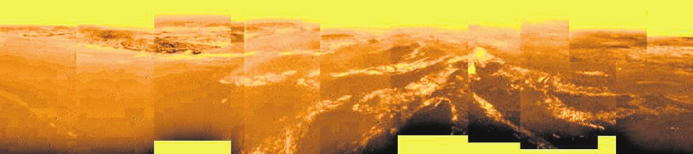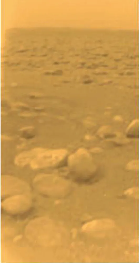В 2005 году на поверхность Титана опустился зонд «Гюйгенс», прилетевший с «Кассини». На снимке (4) — панорама, снятая при снижении. Она составлена из снимков, сделанных с разной высоты, поэтому линия горизонта кажется неровной. Видны светлые возвышенности (на переднем плане они похожи на корни дерева) и темная равнина, видимо бывшая дном озера. На следующем снимке (5) — место посадки в естественных цветах. Камни — ледяная галька, их размер около 15 см. Вообще роль большей части скал, камней и гальки на Титане играет лед.