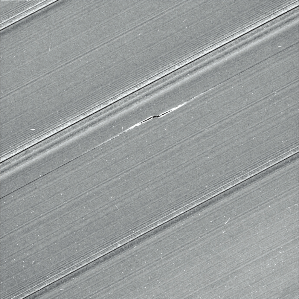 В кольцах есть интересные детали. Например, так называемые пропеллеры. На снимке (7) показан самый крупный, которому присвоено имя авиатора Луи Блерио, первым перелетевшего Ла-Манш в 1909 году. Снимок сделан против солнца, в контражуре; черные прожилки — это места, где материал кольца перекрывает солнечный свет. Очертания «пропеллеров» создают крупные камни, влияющие на кольца своим тяготением.