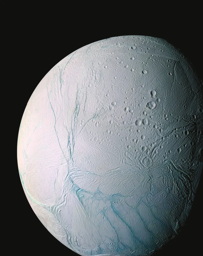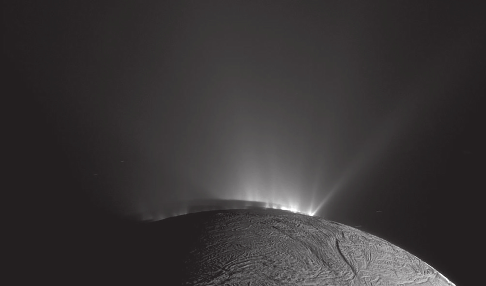 Третье чудо — Энцелад. Это небольшой спутник, его диаметр около 500 км, но на нем есть подледный океан. Более того, «Кассини» напрямую снял «гейзеры» на Энцеладе — выбросы паров воды в космос через трещины в ледяной коре (10). Место, откуда бьют гейзеры, — район «тигровых полос» в нижней части снимка (9). Энтузиасты рассуждают о том, что, как и в подледном океане спутника Юпитера Европы, в океане Энцелада может быть жизнь. Тепло внутри Энцелада генерируется приливным трением из-за вытянутости орбиты спутника.
