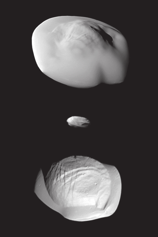 Другая интересная вещь — «пельмени»: мелкие спутники Сатурна, обитающие в щелях колец (их называют спутниками-пастухами). На снимке (8) — Атлас, Дафния и Пан (сверху вниз). Материал из колец оседает на них в виде обручей. Сами спутники гравитационно заперты, повернуты к планете всегда одним и тем же боком, то есть не вращаются относительно колец.