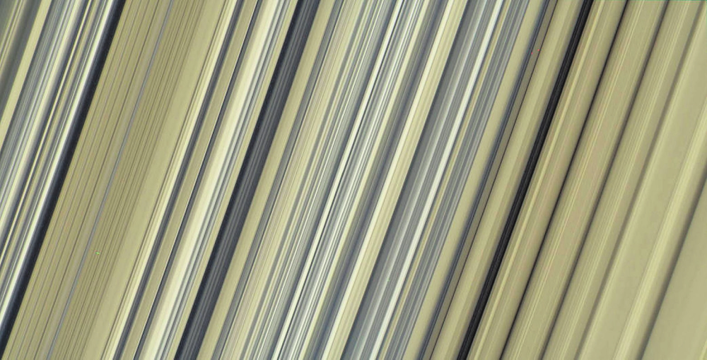 Второе чудо — кольца Сатурна. Еще «Вояджеры» увидели, что они разбиты на сотни тонких колечек. На снимке в естественных цветах — небольшой участок кольца В (6). Тонкие колечки имеют ширину около 20 км, широкие — от 300 до 500 км. Размер пикселя на фотографии — 3 км. На самом деле структура еще тоньше, чем разрешение снимка. Толщина колец поразительно мала по сравнению с их диаметром — всего 10–100 м.