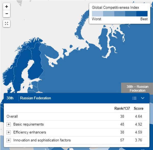 Фото: Кирилл Зыков / АГН "Москва" mskagency.ru Россия поднялась в рейтинге конкурентоспособных стран с 43 на 38 место. Эти данные содержатся в «Индексе глобальной конкурентоспособности 2017-2018», подготовленном Всемирным экономическим форумом (ВЭФ). По оценке аналитиков ВЭФ, этот результат достигнут благодаря улучшениям в макроэкономике по сравнению с 2015-2016 годами.