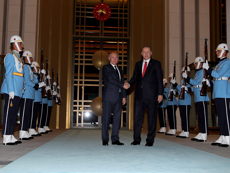 Как сообщает ТАСС, для встречи российского лидера у дворца президента Турции был выстроен почетный караул, лидеры двух стран обменялись рукопожатием.