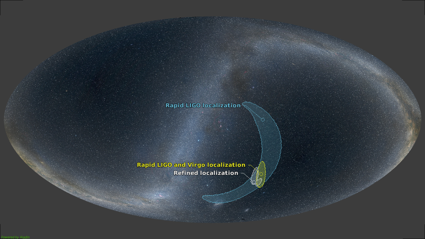 Свечение это очень яркое – его можно сравнить с сотней новых звезд (изначально считалось, что тысячью – отсюда и название). Такое событие вполне можно наблюдать с Земли, если знать, куда смотреть. Если пойман гамма-всплеск, то этого достаточно для очень точной локализации, но он может уйти в другую сторону, и тогда на помощь придут гравитационные волны. Если и когда LIGO вместе с VIRGO поймают волну именно от пары нейтронных звезд, их данные позволят указать относительно небольшой сектор на небе, где в течение следующих недель можно обнаружить свечение в оптическом и инфракрасном диапазоне.