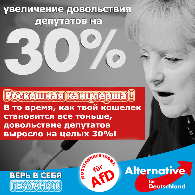 Значительную долю электората AfD составили русские немцы. «Альтернатива» даже выпустила для них брошюру на русском языке со своей программой — такого раньше не делала ни одна партия. На российских телеканалах, которые почти поголовно смотрят русские немцы — а это не менее 4 млн человек, — постоянно подчеркивалась «пророссийскость» AfD, ее готовность снять санкции. Мало того, семь русскоязычных бюргеров были включены в земельные списки партии и прошли в бундестаг.