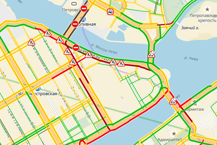 По данным «Яндекс.Пробки», стоит набережная Макарова, Университетская набережная, а также Благовещенский мост.