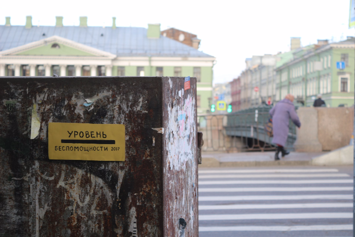 В Петербурге у памятных табличек с отметками о самых сильных наводнениях повесили таблички «Уровень безразличия», «Уровень беспомощности» и «Уровень готовности к войне». Фотографии опубликованы в группе «Заподлицо».