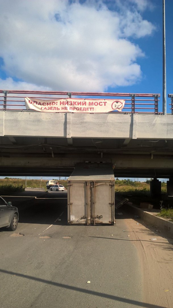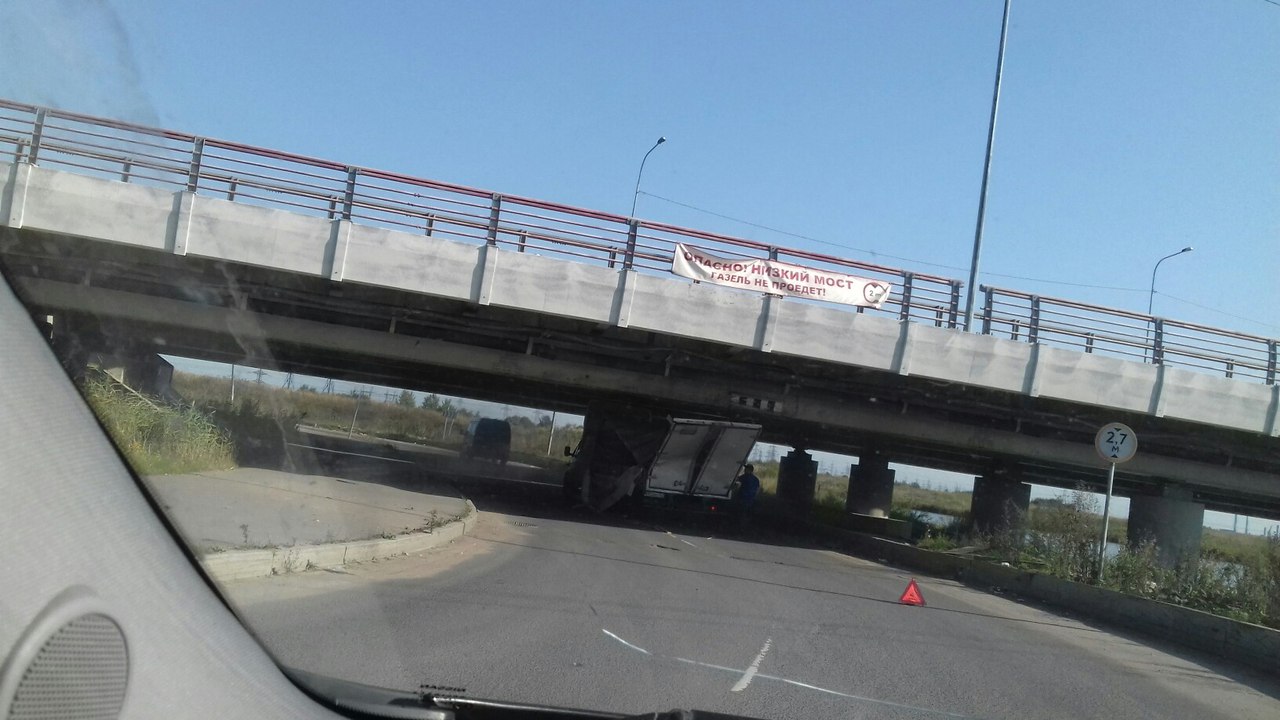 5 сентября очевидцы рассказали, что на Ленсоветовской дороге в Пушкинском районе Петербурга «газель» застряла под мостом, где висит плакат «Газель не проедет».