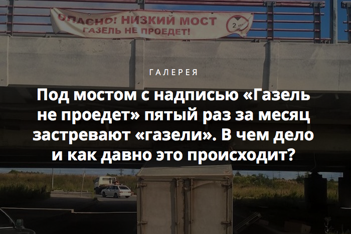 В начале сентября в соцсетях начали обращать внимание на то, что под мостом на границе Шушар регулярно застревают «газели», несмотря на то, что на нем висит плакат «Газель не проедет». В комментариях пишут, что такое происходит регулярно уже не первый год. «Бумага» рассказывает об этих опасных и одновременно нелепых авариях.