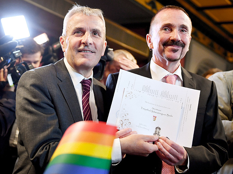 В Германии власти впервые зарегистрировали однополый брак. Свидетельство о заключении брачного союза в ратуше берлинского района Шенеберг в воскресенье, 1 октября, получили 60-летний Бодо Менде и 59-летний Карл Крайль, сообщает Tagesspiegel.