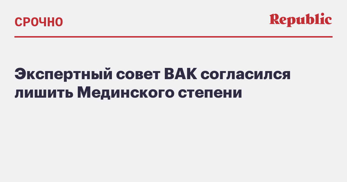 Экспертный совет Высшей аттестационной комиссии (ВАК) согласился лишить ученой степени доктора исторических наук министра культуры РФ Владимира Мединского. Об этом в фейсбуке написал эксперт «Диссернета» Иван Бабицкий.
