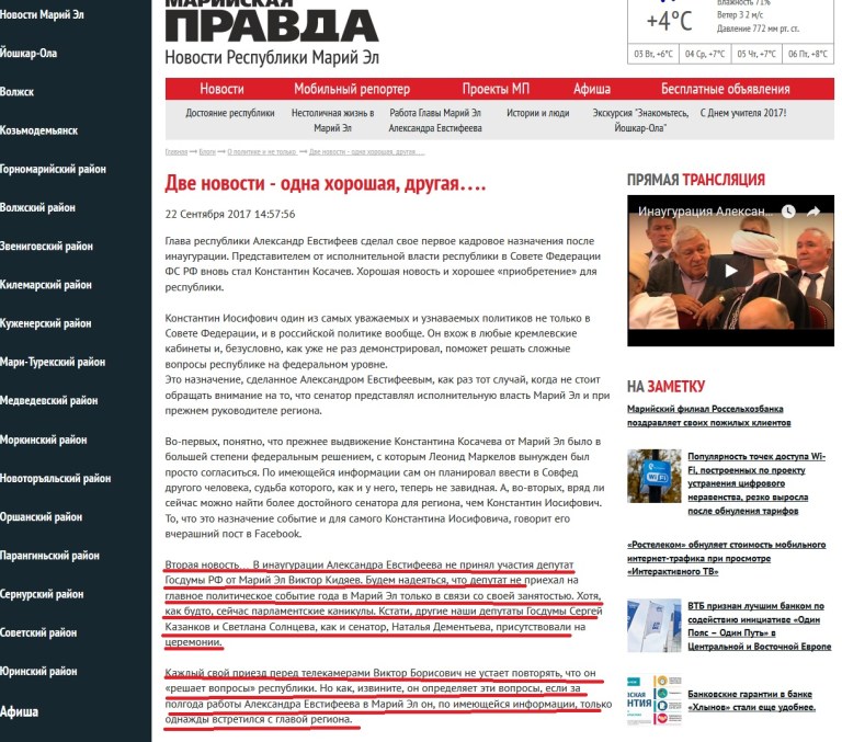 22 сентября 2017 года газета “Марийская правда”, учредителем которой является правительство Марий Эл, опубликовала критическую статью в адрес депутата Госдумы от Единой России Виктора Кидяева под названием “ Две новости - одна хорошая, другая….”. Приведем небольшой отрывок из статьи: