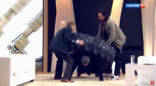 Ренессансная мощь Соловьева нуждалась в физическом подтверждении, и оно не заставило себя ждать. В студию притащили 80-килограммовую шину, которую взвалили на плечи Владимира Рудольфовича. Так он вместе с шиной и отжимался от пола, пока его не остановили.