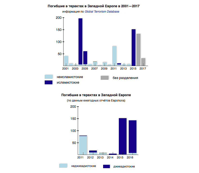 От редакции. С 1970 по 2015 год, cогласно данным Global Terrorism Database, в Европе было совершено 12 593 теракта, из них исламистских — всего 54 (менее 0,5%). При этом жертвами именно исламистских терактов стали за указанный период времени 5380 человек — 5,6% от общего числа погибших. То, что именно от рук исламистов гибнет наибольшее количество людей, ставших жертвами терактов, со всей очевидностью проявилось в последние два-три года, когда теракты стали совершать главным образом адепты так называемого «Исламского государства»**. Так, в 2016 году в Европе от рук террористов погибли 142 человека, из них 135 стали жертвами исламистов. Годом ранее, в 2015-м, только в результате теракта в Париже погибли 130 человек. Теракты 2017 года показывают: в терактах теперь реже используются взрывчатка и огнестрельное оружие, но зато происходить они стали значительно чаще. И как минимум число раненых в результате терактов, особенно — наездов автомобилей, вполне сопоставимо с прошлыми годами, когда приоритет был у «пояса шахида», начиненного взрывчаткой.