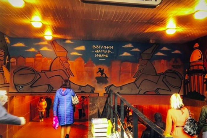 В подземном переходе метро «Купчино» появились граффити Медного всадника, сфинксов и Исаакия