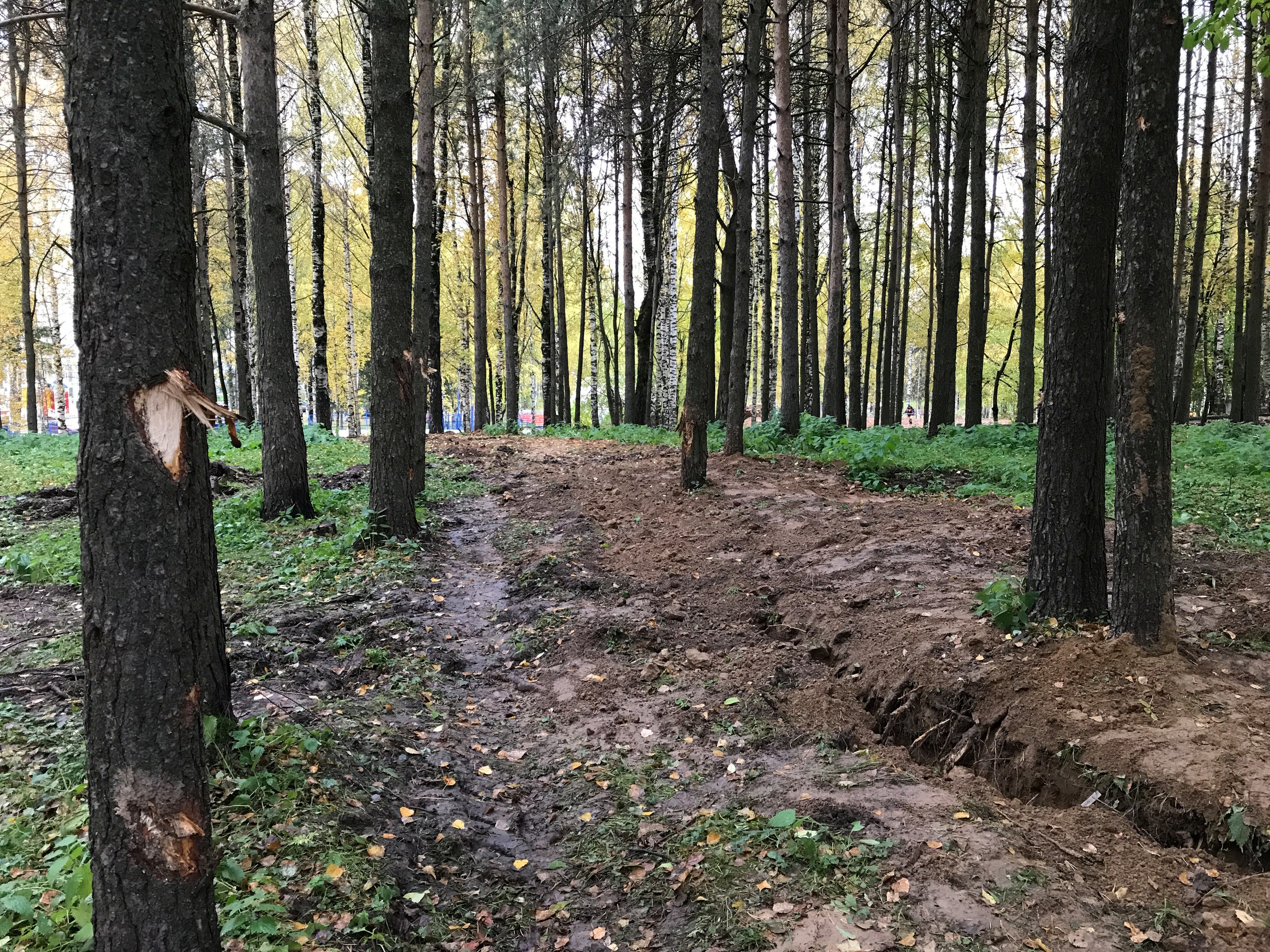 Водитель строительной техники решил срезать по опушке. Глазомер у строителя фиговый, расфигачил наши общественные ели. Ели тут, кстати, выросли сами, парк обустроили в лесу на некогда окраине.