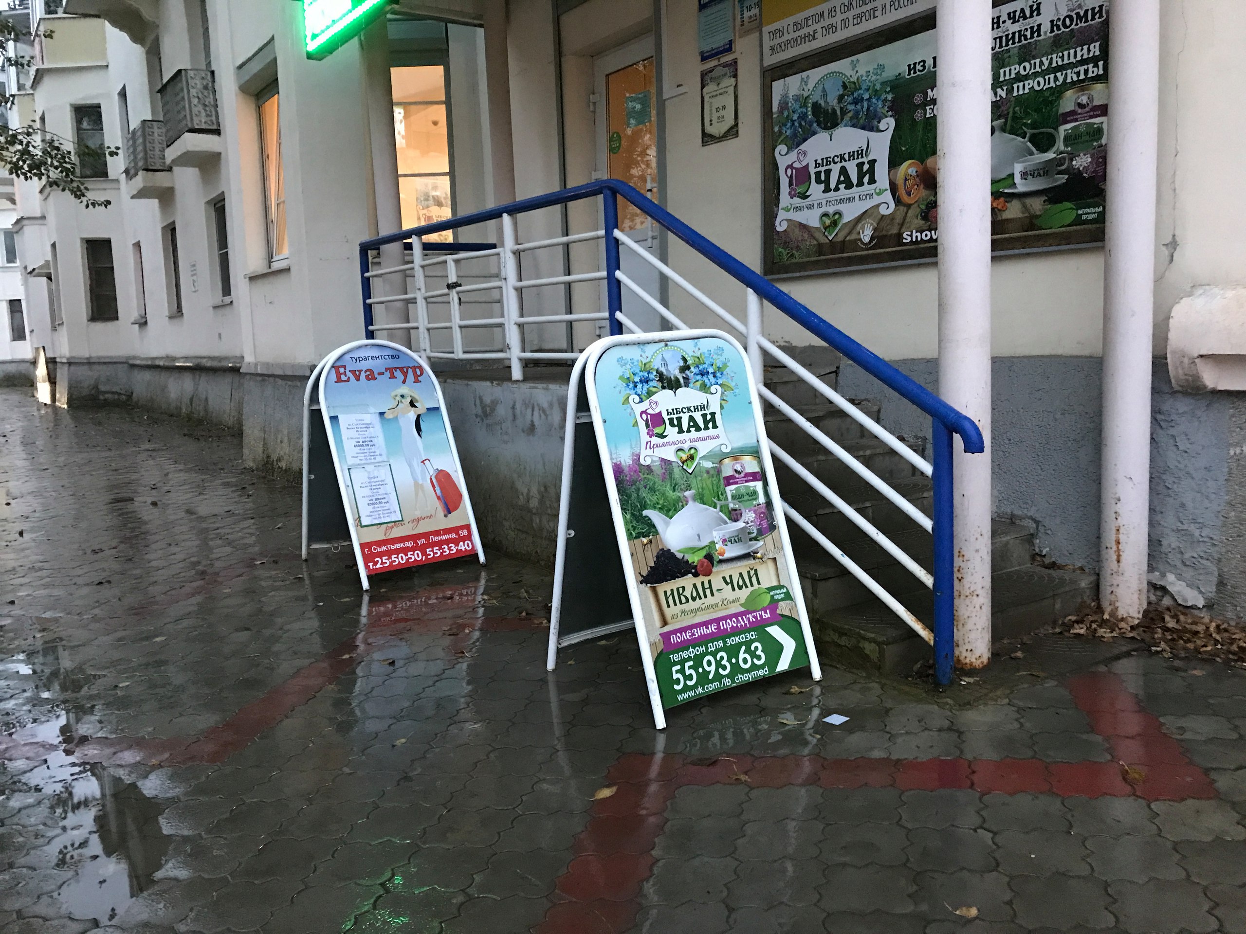 Я уже который год утверждаю, что все рекламные раскладушки надо выкинуть. Позиция мэра Козлова другая, он считает, что если раскладушка красивая и стоит около входа, то пусть себе стоит. Где-то (на самом деле много где) они и вправду стали стоять у входа. Спорное решение, но ладно: