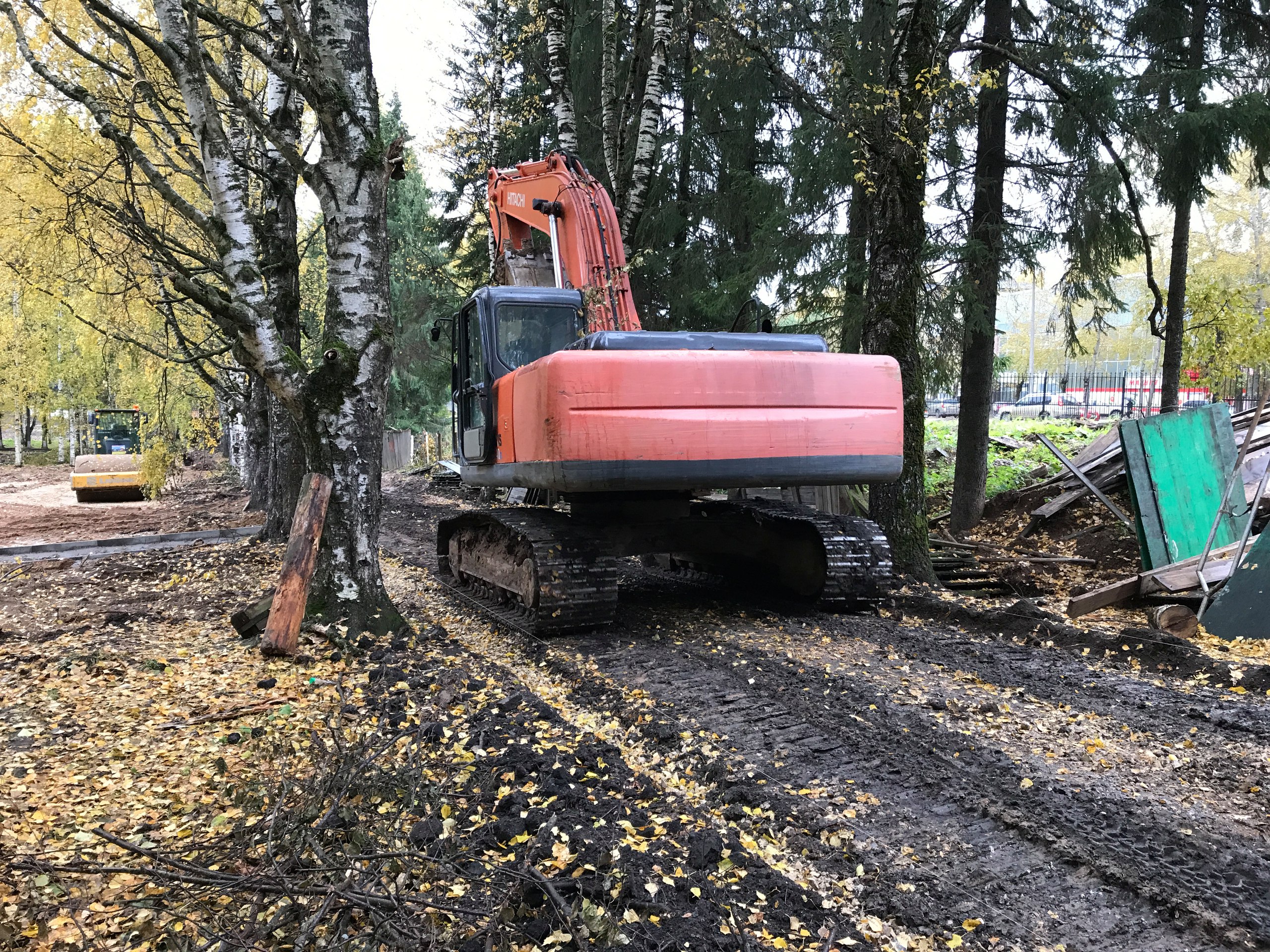 Строители мне поведали, что так как каток всего один, то грунт утрамбовывают экскаватором. Вон он нарезает круги: