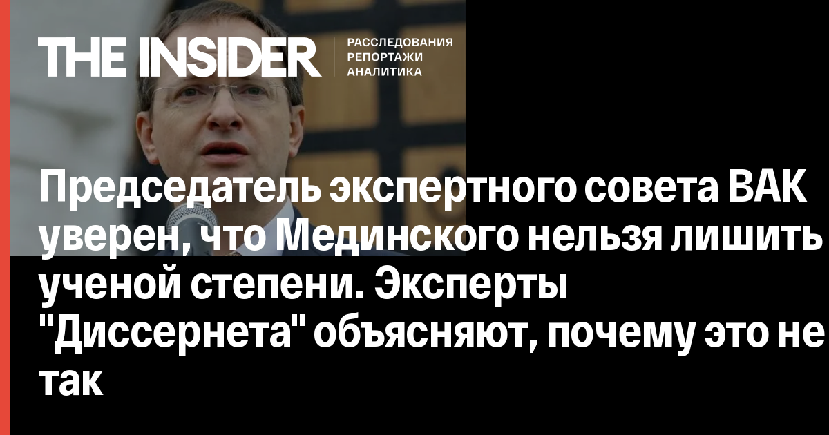 Председатель Экспертного совета Высшей аттестационной комиссии член-корреспондент РАН Павел Уваров заявил, что министр культуры Владимир Мединский получил ученую степень с соблюдением формальной процедуры, поэтому оснований для ее отзыва нет. «Я уверен, что степень, полученная при соблюдении формальной процедуры, не подлежит отмене. Это не контракт и не договор. Претензии, и обоснованные, к Диссертационному совету, к оппонентам, к ВАК, но не к диссертанту», — подчеркнул Уваров. The Insider попросил экспертов прокомментировать это утверждение главы ВАК.