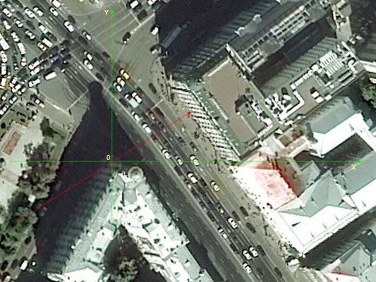 5) На спутниковой схеме для выбранной точки строим оси координат, после чего по схеме обычным транспортиром замеряем азимут Солнца для данного момента времени (Приложение 6).