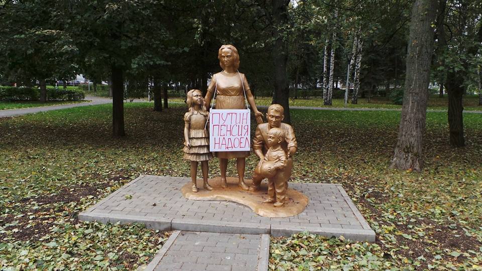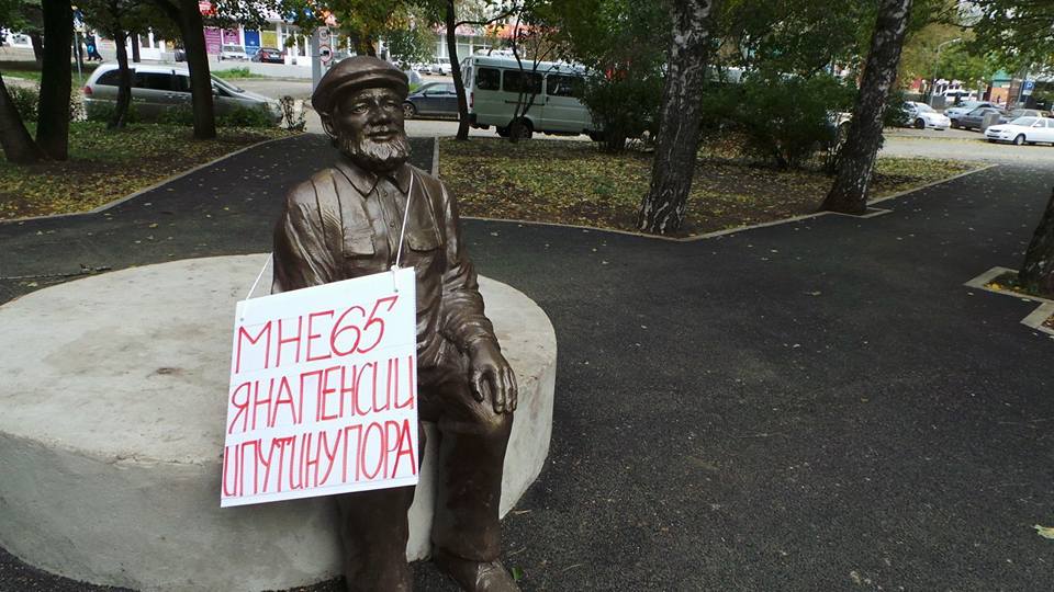 В этот же день активисты местного отделения движения "Открытая Россия" повесили на установленных на уфимских улицах скульптурах плакаты, призывающие отправить Владимира Путина на пенсию, "в связи с достижением им 65-летнего возраста". Так, например, скульптура дачника на остановке "Округ Галле" была украшена плакатом с надписью: "Мне 65, я на пенсии. И Путину пора".