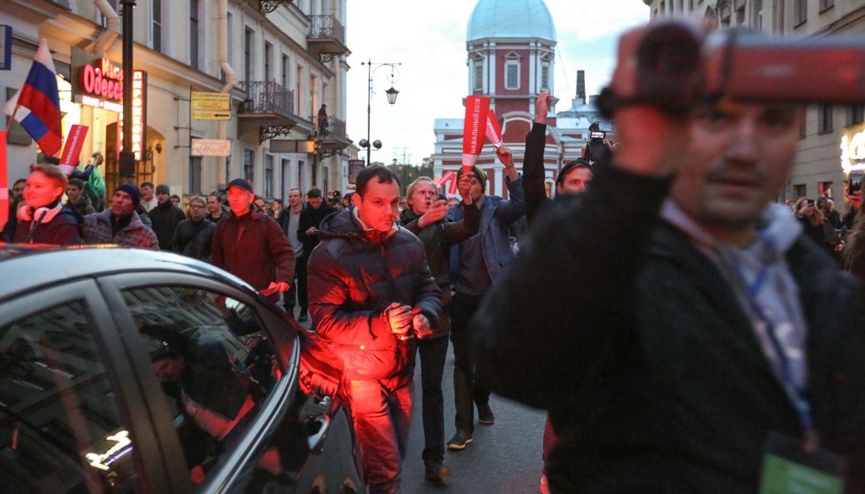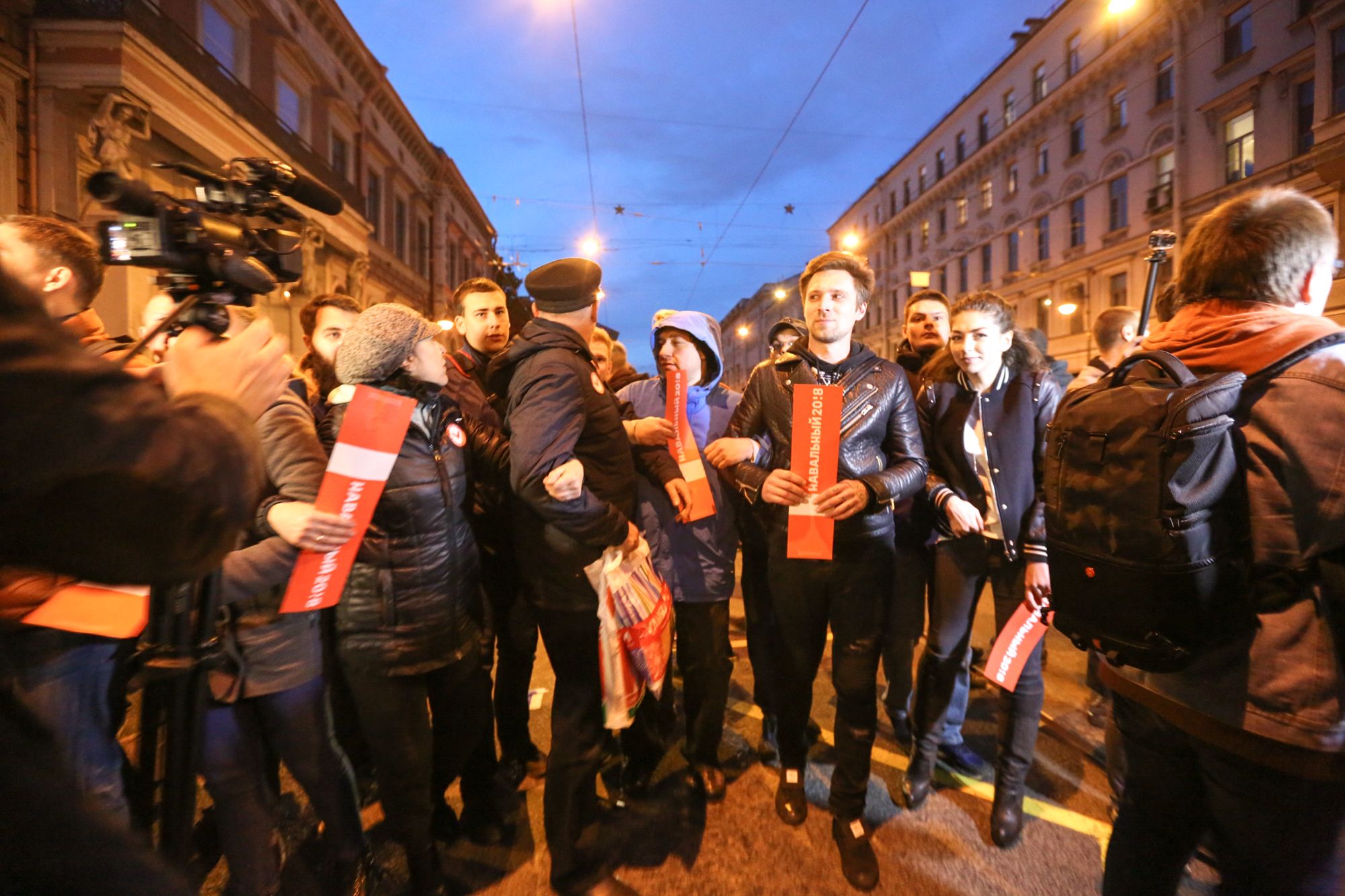 Спустя полчаса толпа митингующих решительно двинулась к выходу с Марсова поля, скандируя «Путин — вор», «Путин — дед» и «С днем рождения, Вова». Несколько сотен человек вышли на Литейный проспект и фактически перекрыли улицу. Поначалу протестующим никто не мешал — однако ближе к пересечению с Невским проспектом им преградила дорогу цепь сотрудников ОМОНа в полном обмундировании. Сторонники Навального (большинству из них на вид было не больше 20 лет) потребовали пропустить их, однако правоохранители отказались это сделать. Скандирование «Полиция с народом» тоже не помогло. Примерно 10 активистов смогли прорвать цепочку ОМОНа и проскочить к выходу на Невский, после чего начались первые задержания.