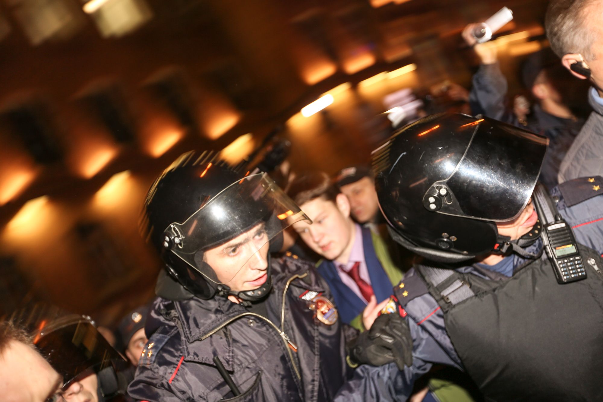Следующие два часа на площади Восстания прошли стабильно. Каждые десять минут полицейские задерживали особенно активных участников акции, а остальных оппозиционеров просили разойтись; те в ответ скандировали «Четвертый срок — тюремный», а однажды даже кинули в машину полиции стеклянную бутылку. Кто-то уходил, но несколько сотен протестующих продолжали оставаться на площади — к тому же с ними то и дело смешивались люди, выходящие из торгового центра «Галерея» (впрочем, в какой-то момент его все-таки закрыли).